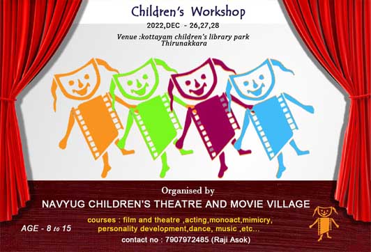 Theatre Workshop conducted by Navyug Childrens Theatre and Movie Village at Kottayam 26, 27, 28 December 2022 at Kottayam Childrens Library Park, Thirunakkara, Kottayam.