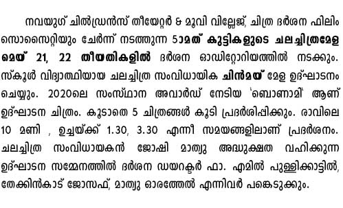 Childrens Film Festival conducted by Navyug Childrens Theatre and Movie Village and Chitradarsana Film Society at Kottayam 13th to 15th September 2019.